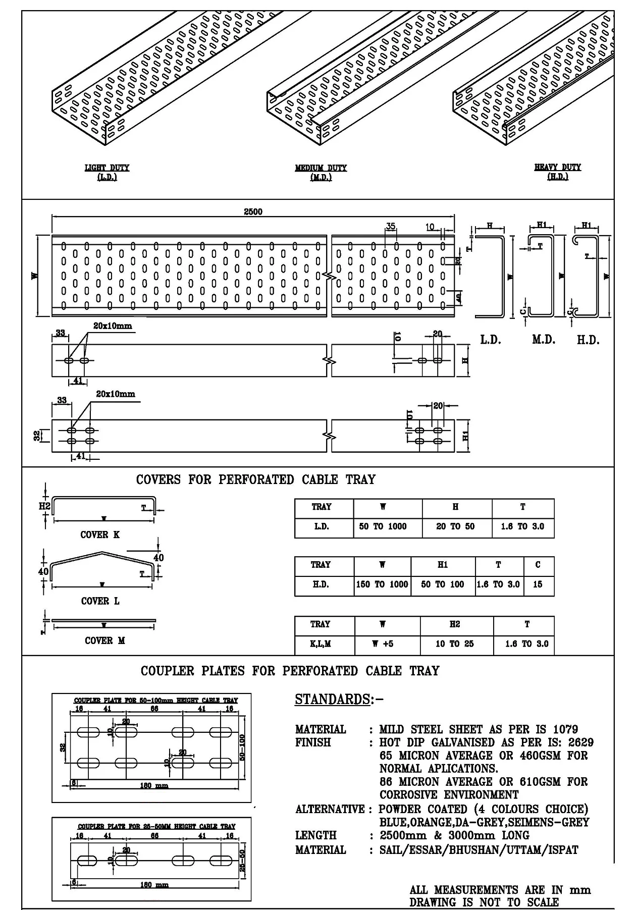Light Duty Perforated Cable TrayLight duty Perforated Cable Tray with special perforation in the base with moderate ventilation with added cable support advantage. |